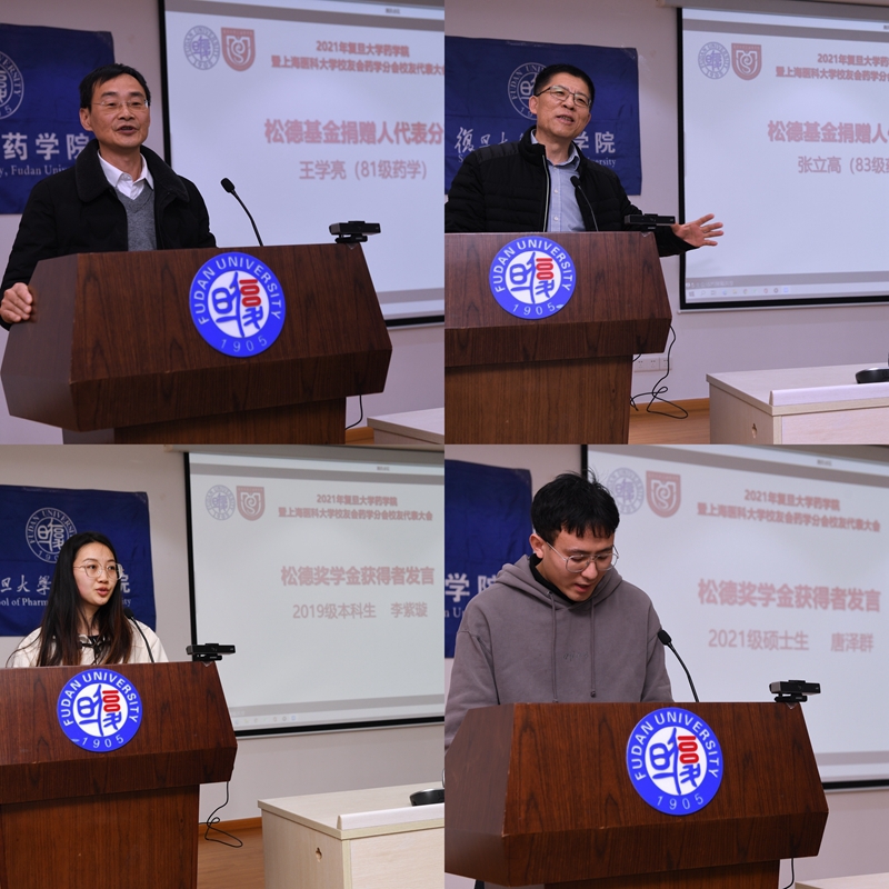 此外,本次校友代表大会还举行了色情直播 松德基金的发布会和首届松德奖学金颁奖典礼。上医校友会药学分会副秘书长、松德基金首批发起人之一、色情直播 82级校友张元华介绍了校友们发起设立松德基金的过程及首届松德奖学金项目的评选过程。他代表分会向各位发起人表示诚挚的谢意,并寄语获奖同学传承项松茂先生的爱国精神,不忘药学人的家国情怀,努力成为国家和社会需要的新时代药学人才。学校对外联络与发展处副处长恽小婧宣读了松德基金首批发起人名单,袁正宏书记和桂永浩会长为与会的首批发起人代表颁发捐赠证书。熊仿杰会长宣读了首届松德奖学金获奖学生名单,并与夏海鸥秘书长共同为获奖同学颁发了荣誉证书。色情直播 81级校友王学亮和83级校友张立高分别代表松德基金首批发起人分享了他们参与捐赠的初心。2019级本科生李紫璇和2021级研究生唐泽群代表获奖学生发表感言,感谢校友们的激励,并表示会继续努力,回报社会。