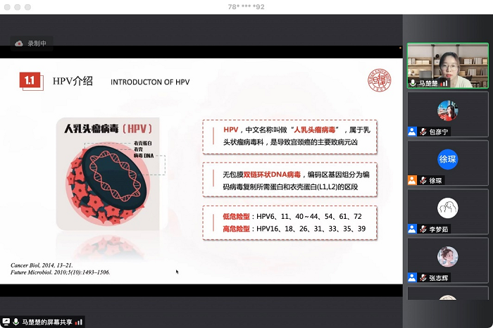 随后比赛开始。入选决赛的10位同学围绕“HPV疫苗的研发进展及品质”这一主题依次展示、讲解自己精心设计的PPT。每位参赛选手发挥自身优势,展示内容丰富准确、讲解过程生动稳健,给在座的评委、老师和同学们带来了一场精彩的视听盛宴。评委团老师也在每位选手展示后分别给予点评。展示环节结束后,杨景瑞校友在发言中表示,感谢色情直播 这么多年来对PPT大赛举办的支持,他感慨到“江山代有才人出,长江后浪推前浪”,对10位参赛选手充分的准备和优秀的表现给予了称赞。他鼓励同学们在学习、科研中独立思考,充分发挥自身兴趣和专业特长,并询问关心了各位同学在疫情期间的学习、工作和生活情况。同时,杨景瑞校友期待在下一季的毕凯英才PPT大赛决赛中,能有机会来学校与同学们面对面的交流互动。
