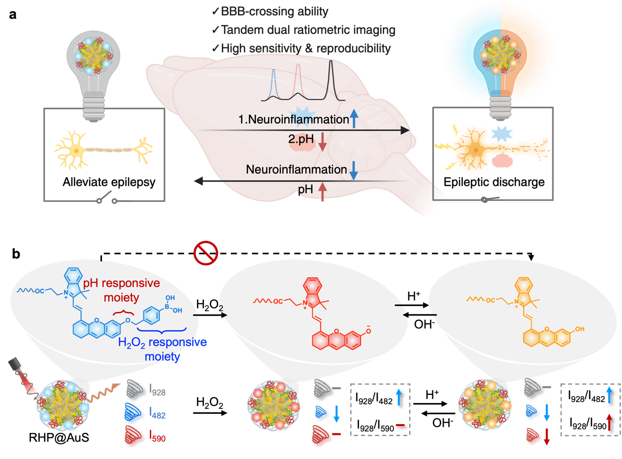 癫痫是一种以神经元“兴奋-抑制”失衡、同步化异常放电为特征的脑疾病,是最常见的致死、致残性脑疾病之一。目前癫痫治疗药物靶标主要是神经元离子通道或者神经递质受体,仅可控制癫痫发作状态,无法阻断疾病进展或从根本上抑制癫痫的发生。大脑微环境pH稳态在调控神经元电活动、神经突触可塑性、胶质细胞功能,及神经退行性疾病演进等方面具有重要意义。生理条件下,脑细胞外pH值维持在7.2-7.4范围内,0.2个pH单位的微小波动即可调控离子通道和代谢酶活性影响神经元兴奋性。但不同神经元亚群对pH变化的响应呈现差异性,例如碱性微环境会增强脑部神经元兴奋性,而化学敏感神经元则对酸性刺激呈现激活特征。因此,动态监测癫痫病灶pH波动有望为解析pH-神经兴奋性偶联机制、揭示癫痫演进规律提供关键证据。