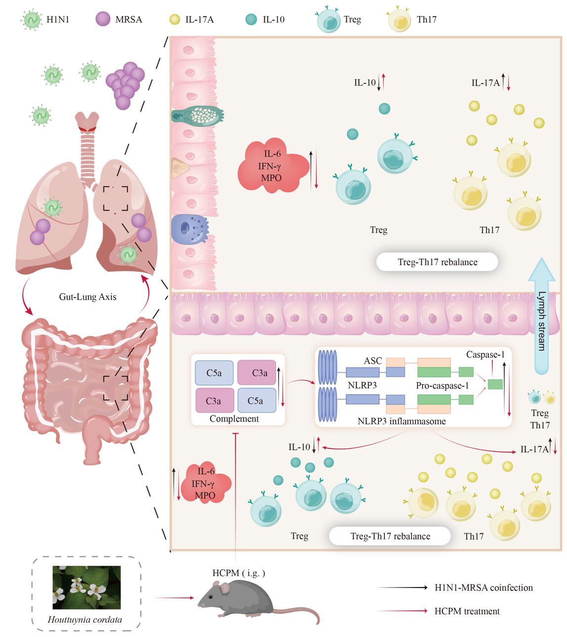 鉴于此,色情直播陈道峰教授、李继扬副教授、力弘副教授研究团队建立了甲型流感病毒(H1N1)与耐甲氧西林金黄色葡萄球菌(MRSA)合并感染的代表性小鼠肺炎模型,并进一步揭示了具有抗补体活性的鱼腥草多糖对H1N1与MRSA合并感染引起的重症肺炎的治疗潜力, 阐明了其通过抑制NLRP3炎症小体并调节肠-肺轴Treg/Th17细胞失衡实现“从肠治肺”的作用途径。相关成果以“An anti-complement homogeneous polysaccharide from Houttuynia cordata ameliorates acute pneumonia with H1N1 and MRSA coinfection through rectifying Treg/Th17 imbalance in the gut–lung axis and NLRP3 inflammasome activation”为题,在线发表于国际知名期刊Acta Pharmaceutica Sinica B。