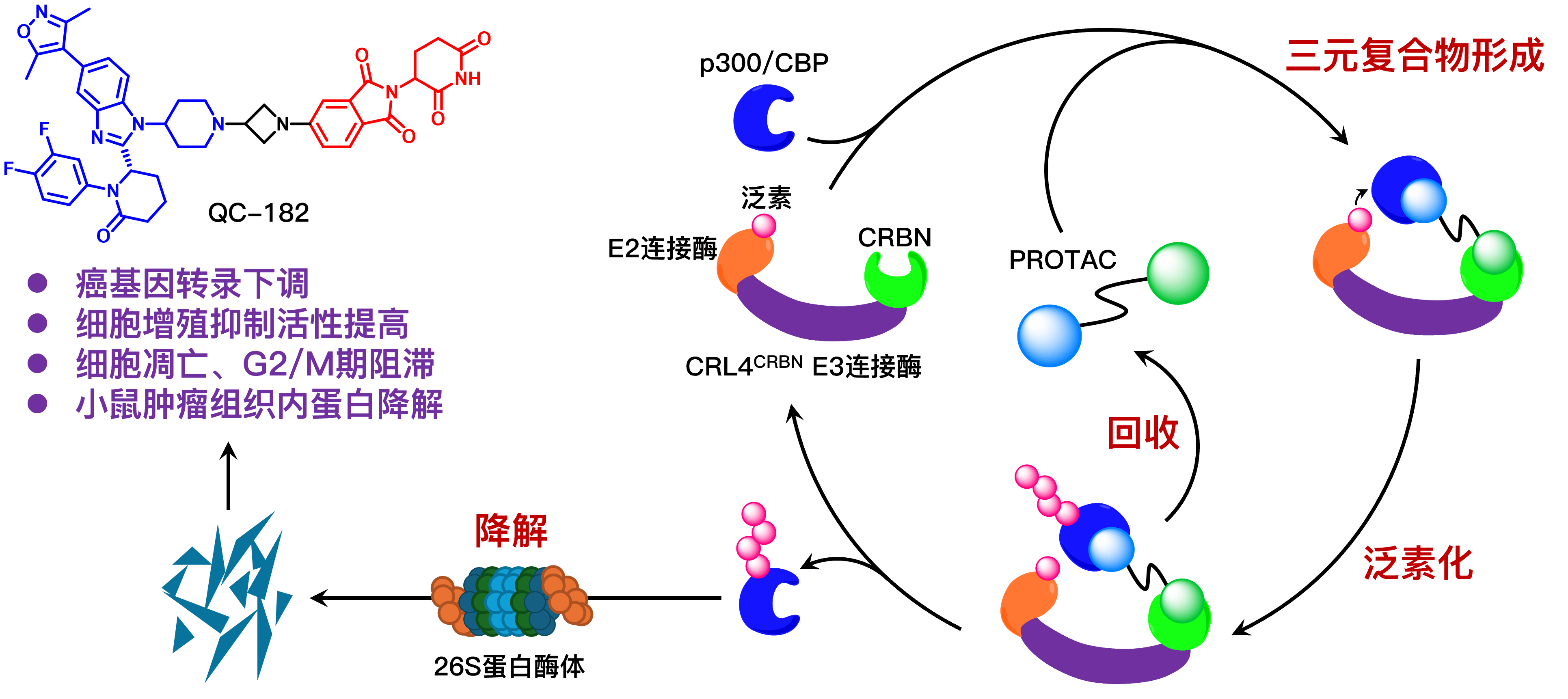 本研究选择临床试验进展最快的p300/CBP溴结构域抑制剂CCS1477作为构建靶向p300/CBP PROTAC降解剂的靶蛋白配体原型,通过复合物晶体结构分析结合生化实验检测,确定并验证了合适的接头位点,从而进行PROTAC分子的构建和肝细胞癌细胞中的靶蛋白降解活性筛选,最终得到了优选p300/CBP PROTAC降解剂QC-182。该分子能够通过PROTAC作用机制有效降解SK-HEP-1细胞中的p300和CBP蛋白。经测序分析发现,QC-182可显著下调p300/CBP调控的转录组水平,特别是参与上皮−间质转化和G2/M期检查点的癌基因转录。QC-182相比于原型抑制剂CCS1477和近期报道的降解剂dCBP-1具有更显著的抗增殖活性,同时可诱导细胞凋亡和G2/M期阻滞。小鼠体内研究结果发现,QC-182可降解SK-HEP-1小鼠肿瘤组织中的p300和CBP蛋白。综上,QC-182是一种有效的p300/CBP PROTAC降解剂,进一步优化有望得到抑制肝细胞癌和其他实体瘤生长的先导化合物。