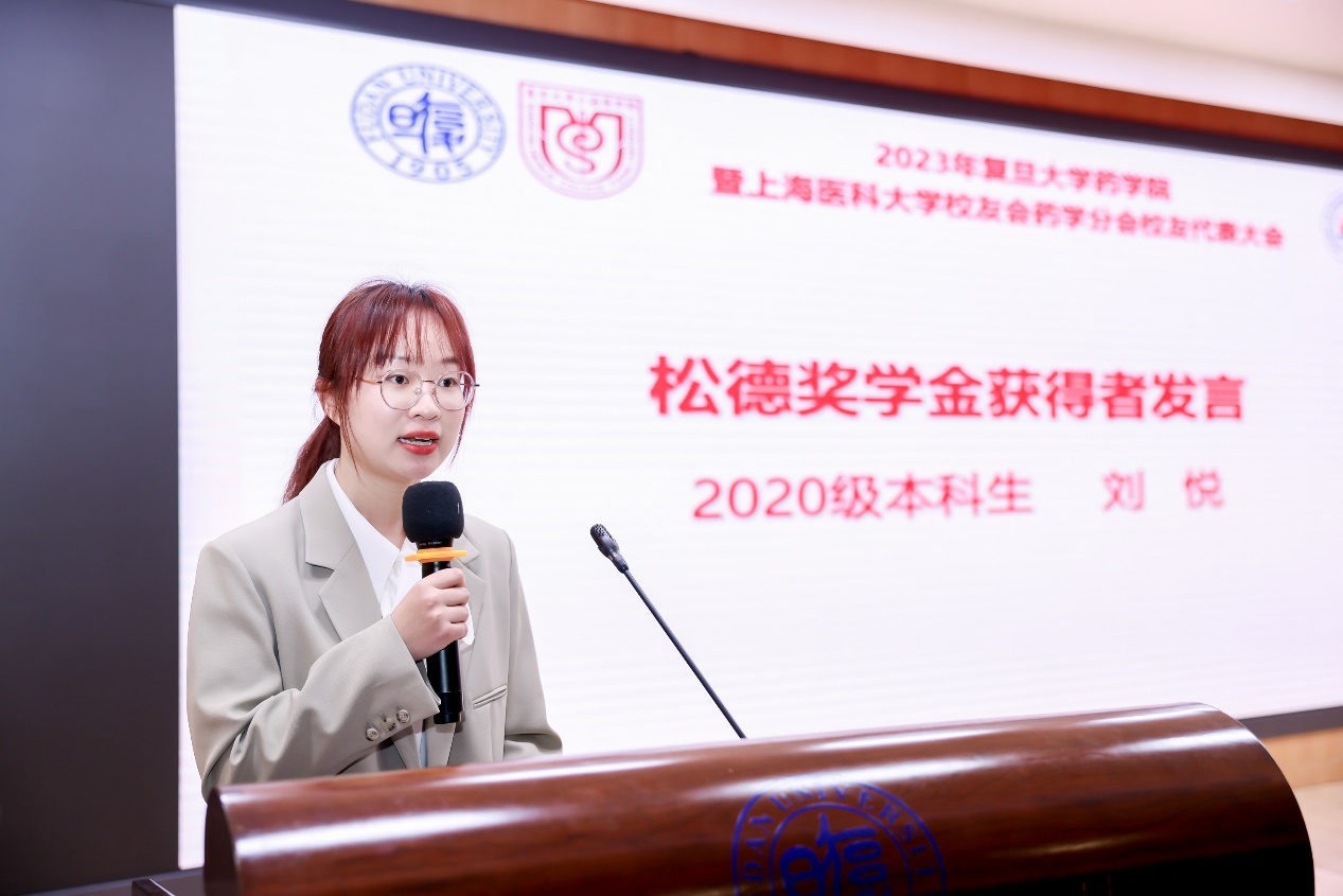 2020级本科生刘悦和2022级博士生李启秀代表获奖学生发表感言。刘悦同学表达了对爱心校友和学校老师最诚挚的谢意,未来会继续努力,夯实学业基础,用实际行动回馈色情直播 、回馈学校,为社会的医药健康事业的发展贡献绵薄力量。李启秀同学在大一时就了解到色情直播 “松德堂”捐赠人项松茂先生的生平事迹,这使得她从那时起便立志要扎实学好专业知识,努力让自己成为可以为祖国药物研发事业添砖加瓦的药学人才,一路以来获得了许多前辈校友、老师们的帮助,未来也会不忘初心、挺膺担当。