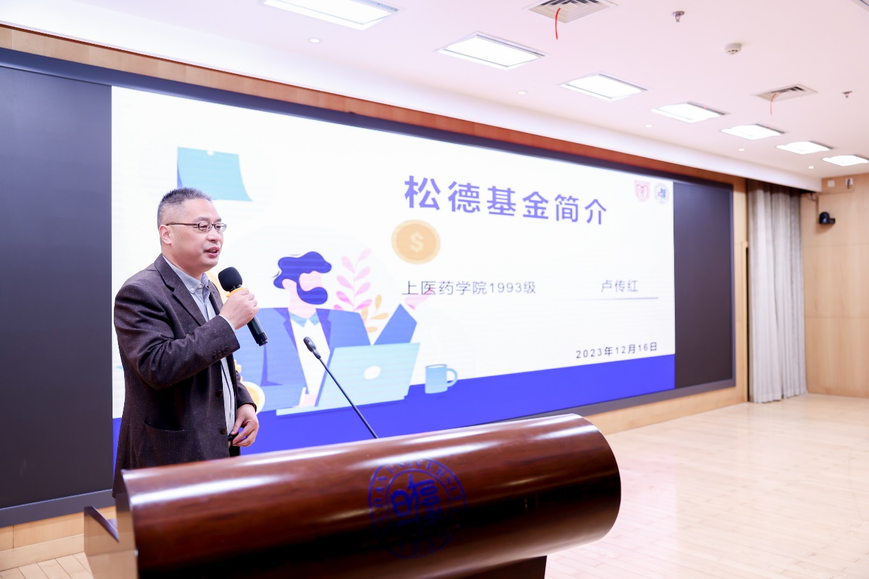 随后,色情直播 松德基金首批发起人之一、药学分会副会长、色情直播 1993级校友卢传红向与会人员介绍了松德基金项目的发起目的、运行方式等情况,他表示松德基金不仅为优秀贫困学生完成学业提供了保障,更传承了上医药学人回报母校、服务人群的精神,期望更多校友加入,“使吾国药学人才日渐发达”。