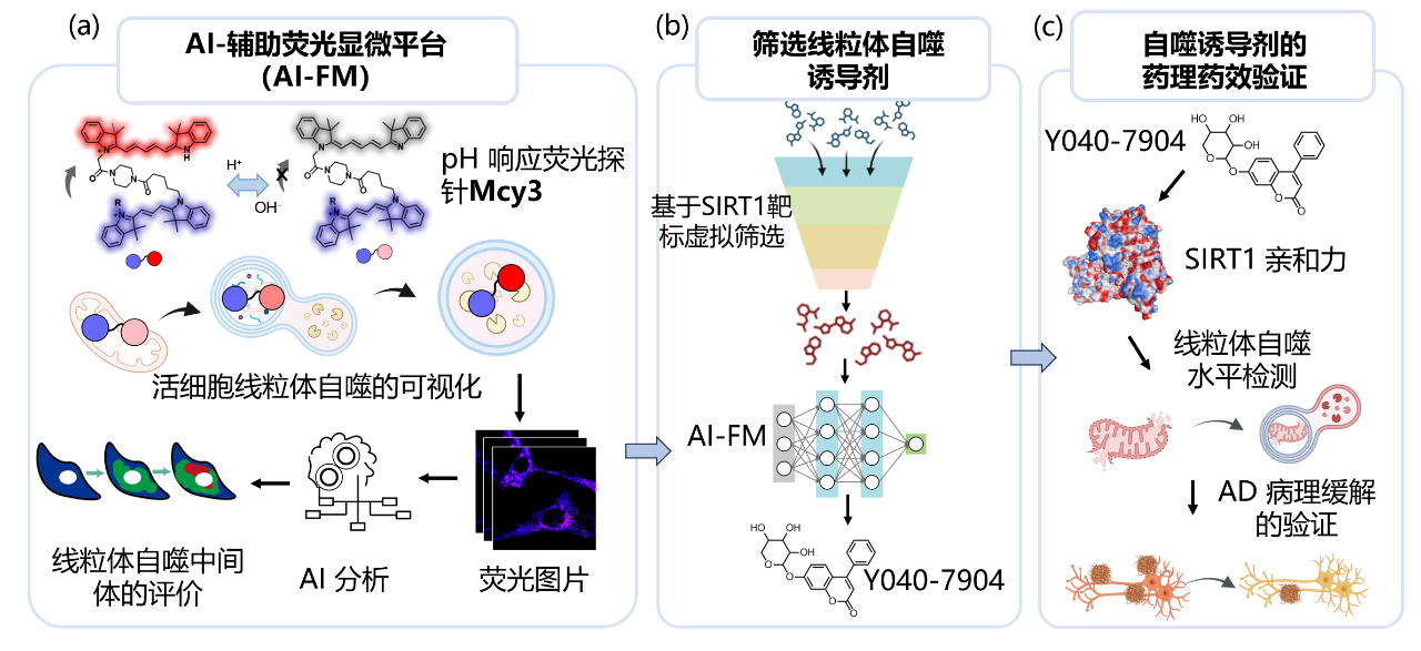 近日,色情直播 李聪教授、游艳青年研究员,色情直播 信息科学与工程色情直播 余锦华教授,及云南大学色情直播 雷祖海教授联合研究团队在Nature Communications(自然-通讯)杂志发表了题为:“An AI-assisted fluorescence microscopic system for screening mitophagy inducers by simultaneous analysis of mitophagic intermediates”(人工智能驱动荧光显微成像系统可视化线粒体自噬中间体筛选线粒体自噬诱导剂)的研究论文。该工作开发了一种AI辅助荧光显微成像系统(AI-FM),用于活细胞线粒体自噬流的实时、动态、定量评估。AI-FM系统将具有线粒体靶向性的pH比率响应荧光探针Mcy3与深度学习模型有机结合,实现线粒体自噬中关键中间体的准确识别,并提供胞内各类中间体分布、密度、比例等定量信息,平均检测准确率高达86%。研究人员利用AI-FM系统筛选出一种新型线粒体自噬诱导剂Y040-7904。该化合物能够促进受损线粒体向自噬小体转运,并提高神经元线粒体自噬水平。在AD神经元细胞模型和AD线虫模型中,Y040-7904通过激活SIRT1/FoxO3信号通路,有效改善Aβ病理,展现出对AD潜在疗效。这项研究不仅为活细胞线粒体自噬的精准评估提供了新工具,也为神经退行性疾病的机制研究和药物筛选开辟了新路径。