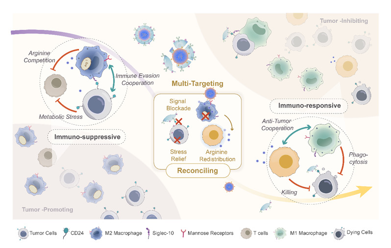 然而,涉及肿瘤和免疫细胞的复杂细胞相互作用网络表现出高度的灵活性和可塑性,需要跨多种细胞类型进行协调调节,以重塑竞争-合作模式。在这些概念的基础上,作者旨在开发一种递送系统,该系统集成了多种调节模块,同时保持功能分离,从而能够精确调节不同的细胞状态。