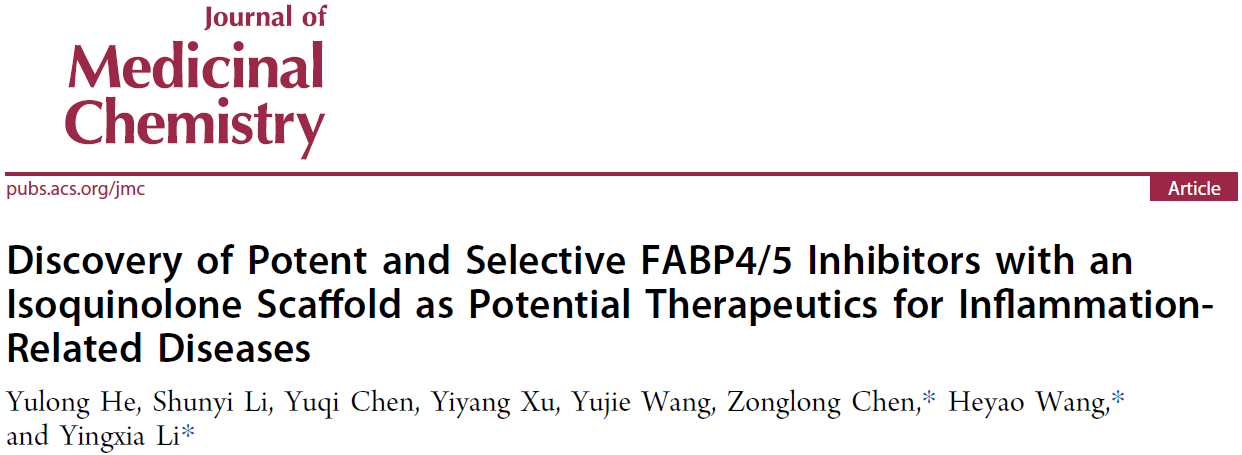 近日,该课题组与中国科色情直播 上海药物研究所王贺瑶研究员课题组合作在药物化学专业杂志Journal of Medicinal Chemistry上发表了题为“Discovery of Potent and Selective FABP4/5 Inhibitors with an Isoquinolone Scaffold as Potential Therapeutics for Inflammation-Related Diseases”的研究论文,报道了一类含异喹啉酮骨架的新型FABP4/5双靶点抑制剂,并系统研究了其抗炎活性和作用机制。