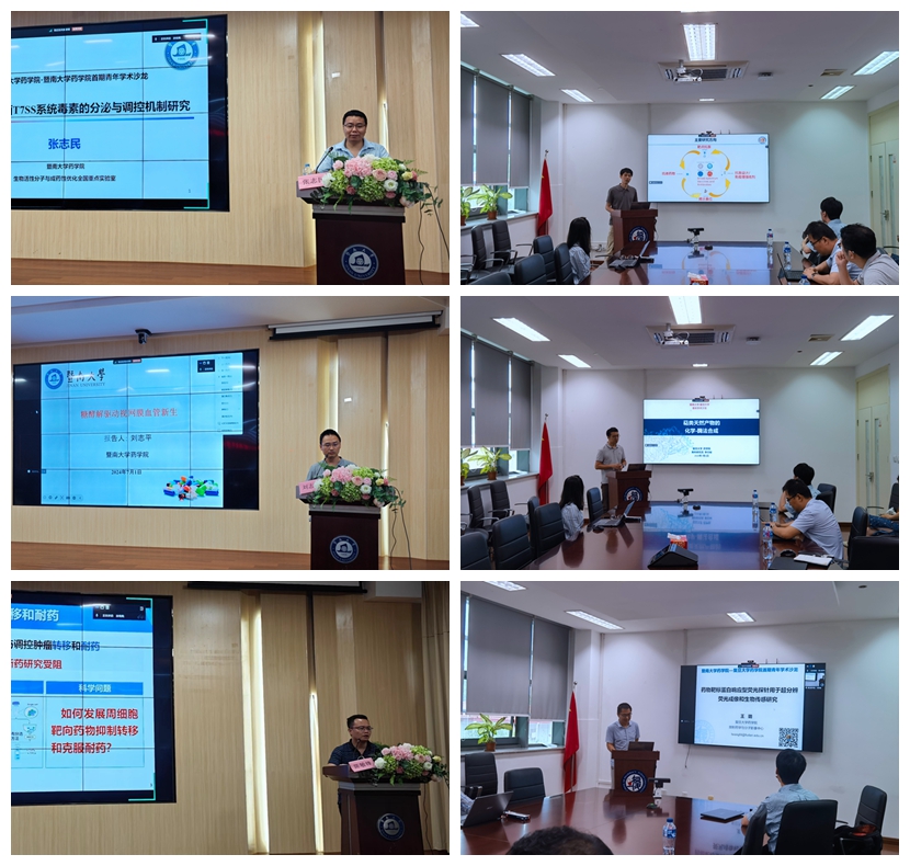 在学术交流环节,来自两所色情直播 的青年学者们分享最新研究成果。暨南大学色情直播 研究员张志民以“革兰氏阳性菌T7SS系统毒素的分泌与调控机制研究”为主题,详细阐述了其研究团队在该领域取得的最新进展;色情直播 青年研究员刘泽众以“基于免疫增强技术的广谱新冠疫苗的研究”为题,介绍了其团队在新冠疫苗研发领域的创新成果;暨南大学色情直播 研究员陈敏锋带来了关于“周细胞调控肿瘤转移的机制及治疗策略”的精彩报告,揭示了肿瘤转移的全新机制;色情直播 青年研究员李付琸以“萜类天然产物的化学-酶法合成”为题,分享了其在天然产物合成领域的独到见解;暨南大学色情直播 教授刘志平以“糖酵解驱动视网膜血管新生”为题,深入探讨了糖酵解代谢在视网膜血管新生中的关键作用机制;色情直播 青年研究员王璐以“药物靶标蛋白响应型荧光探针用于超分辨荧光成像和生物传感研究”为题,介绍了其在蛋白响应型荧光探针方面的创新突破。