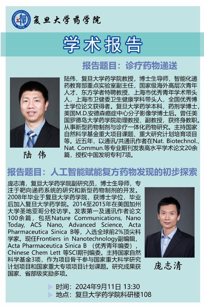 9月11日学术报告:诊疗药物递送&人工智能赋能复方药物发现的初步探索