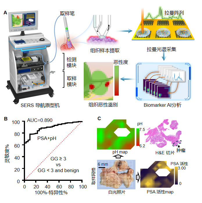 图1. 免标记拉曼导航系统术中实现前列腺癌恶性分级。(A)手术导航系统工作流程示意图。(B)术中检测组织间液酸化(pH)和前列腺特征抗原(PSA)活性双分子标志物定位GG≥3前列腺癌组织的受试者操作特征曲线。(C)病人前列腺组织白光照片、H&E染色切片与pH和PSA活性分布图。