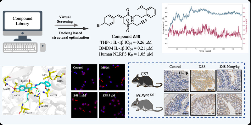 课题组运用计算机虚拟筛选技术,对商用化合物库和组内化合物库汇总的约260,000余个化合物进行筛选,获得10个具有NLRP3结合潜力的化合物,通过筛选实验确定了具有良好IL-1β抑制活性的先导化合物EBC-44274。并在分子动力学模拟和对接的基础上,明确了先导化合物和NLRP3的作用模式,并以此设计并合成了54个衍生物。通过对这些合成化合物体外活性的评估,课题组发现优选化合物Z48是一种新型 NLRP3抑制剂(0.26 μM in THP-1 cells and 0.21 μM in BMDMs)。实验结果表明,化合物Z48可以直接与NLRP3蛋白结合(KD = 1.05 μM),特异性抑制NLRP3炎症小体的活化,而对AIM2和NLRC4没有抑制作用。值得注意的是,Z48能有效抑制尼日利亚菌素、ATP和MSU诱导的IL-1β释放,从而确定了其作为一种广谱NLRP3炎症小体抑制剂的地位。随后的体外研究表明,Z48能有效阻断ASC的寡聚,影响NLRP3-ASC和NLRP3-NEK7的蛋白-蛋白相互作用,从而抑制NLRP3炎性体的组装。体内实验结果表明,Z48在缓解DSS引起的结肠炎方面效果显著,活性优于阳性对照SASP。但是,Z48无法影响DSS诱导的NLRP3KO小鼠的结肠炎病情,说明Z48确实是通过NLRP3炎症小体发挥抗原作用的。总之,化合物Z48具有治疗与NLRP3炎症小体相关的慢性炎症性疾病的潜力,有望成为一种新的治疗药物。