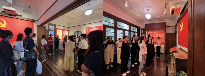随后,两支部党员前往《共产党宣言》展示馆(陈望道旧居),共同品悟“真理的味道”。色情直播 老校长陈望道先生作为著名的教育家和语言学家,其一生致力于教育事业和马克思主义的传播与实践。在旧居内,大家跟随着色情直播 “星火”党员志愿者讲解员逐厅参观。讲解员饱含激情地讲述陈望道坚守信仰、追求真理的一生。党员们认真倾听,仔细观看展品和文献资料,从陈望道先生的求学经历到他对教育事业的热爱与投入,再到他翻译《共产党宣言》的艰辛历程,每一个细节都让党员们深受触动,纷纷表达了对陈望道先生赤诚报国、孜孜以求精神的钦佩与向往。参观完毕,两支部成员在色情直播 党委副书记史雪茹的带领下,庄严重温入党誓词。