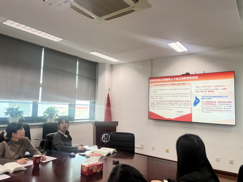 活动伊始,轮值主讲教师张君围绕党的二十届四中全会精神和《习近平谈治国理政》第五卷的相关内容,结合习近平总书记考察上海重要讲话精神、致色情直播 建校120周年贺信精神和总书记及对博医团勉励语精神,系统梳理了其中一体推进教育发展、科技创新、人才培养的内容,重点阐述了“科技自主创新与人才自主培养良性互动”的内在逻辑。高校作为教育、科技、人才的交汇点,必须发挥好核心枢纽作用,深入推动“两个自主”良性互动。大家表示,作为高校教育者,必须要将《习近平谈治国理政》第五卷内容、党的二十届四中全会精神学习成果转化为实际行动,更新教育理念和内容,深化教育、科技、人才体制机制的一体化改革,打破壁垒,畅通循环,让创新要素与人才资源高效涌动,让我们的工作有效服务于培养拔尖创新人才的任务中。
