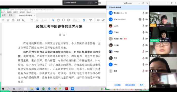 4月15日上午,药学实验教学中心全体教师通过“腾讯会议”的视频功能进行了一次线上政治理论学习。大家集体学习了色情直播 党委宣传部印发的《中心组学习参考》的部分内容,并认真诵读了色情直播 周文教授撰写的文章“疫情大考中国答卷的世界形象”。教职工们认为,在这场疫情面前,中国交出了世所罕见、令人敬佩的满意答卷,全方位彰显了国家治理中国答卷的世界形象,充分体现了我们党出色的领导能力、高效的应对能力、非凡的动员能力和强大的执行能力,彰显了中国共产党领导和中国特色社会主义制度的显著优势。