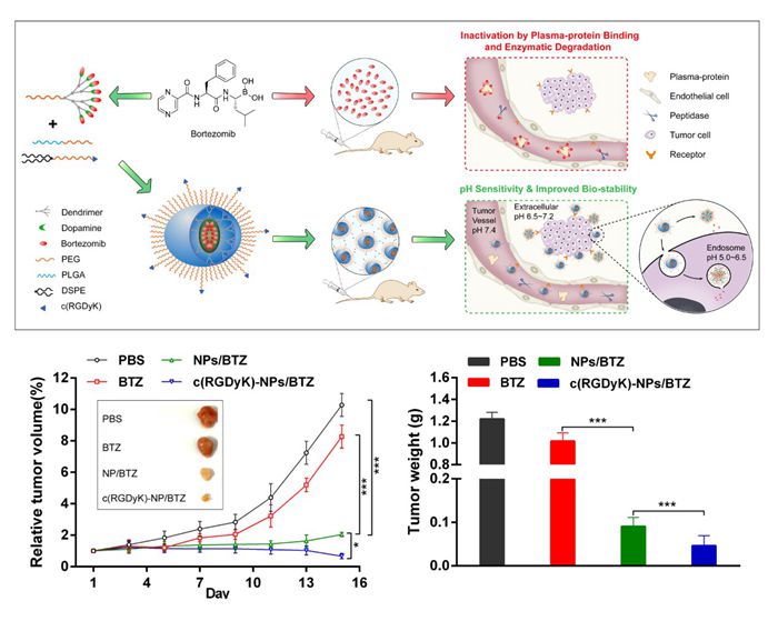 针对硼替佐咪制剂存在问题,陆伟跃教授团队与王浩研究员通力合作,设计了一条以聚乙二醇为亲水链、修饰多个多巴胺分子超支化聚酯为亲脂链的高分子载体,并将其与硼替佐咪在非水介质中混合形成硼酯类硼替佐米前药。在血液循环中,该前药中硼替佐咪的硼酸基团受到保护而提高其稳定性和降低毒性,但确能在实体瘤组织的微酸环境中和肿瘤细胞内的酸性环境中释放硼替佐咪原药。该硼替佐米前药再与PEG-PLGA和RGD-PEG-DSPE混合制备成的硼替佐米纳米药物制剂,可借助靶向分子RGD识别实体瘤组织并跨越血-肿瘤屏障将药物递送到肿瘤组织和肿瘤细胞内,以实现对实体瘤的精准打击。