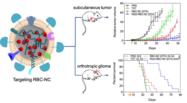 目前,脑胶质瘤的临床治疗以手术切除为主,辅之以放化疗。由于脑胶质瘤缺乏明显边界,手术难以将其切除干净而极易导致复发;同时,脑胶质瘤部位多重屏障的存在又阻碍了化疗药物进入,致使肿瘤部位无法获得有效药物浓度;高剂量化疗药物使用也会带来多种严重毒副作用。如何提高脑胶质瘤部位的抗肿瘤药物浓度,在提高药效的同时降低全身性毒副作用?色情直播陆伟跃教授课题组的合作研究构建了一种主动靶向仿生纳米药物,采用1)红细胞膜包覆药物纳米晶策略:一是利用红细胞膜大幅度延长所包载药物在血液中的循环时间,为药物进入病灶部位创造更多可能的机会;二是提高药物包载量,以增加该仿生纳米药物每次到达病灶部位的药物浓度;2)靶向分子介导跨越屏障膜策略:在红细胞膜上插入能够识别脑胶质瘤屏障膜的靶向分子,赋予该仿生纳米药物在病灶部位及肿瘤细胞内药物聚集量,从而发挥更好的药物治疗效果。