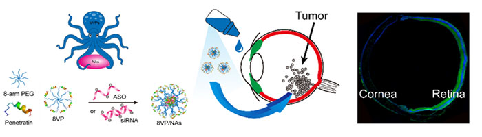 该研究团队近期受到章鱼的启发,以生物相容性良好的多臂聚乙二醇为内核,每个侧链末端连接优选的多肽类眼部吸收促进剂Penetratin,构建了一种类似章鱼结构的柔性多价Penetratin(MVP)作为递送基因的载体。该载体所带正电荷使其能够与荷负电的基因(反义寡核苷酸或小干扰RNA)自组装形成尺寸小于100 nm的复合物,其部分Penetratin手臂用于压缩和携载基因,其余Penetratin手臂向外自由伸展,保持对眼部吸收屏障的高效渗透能力。经滴眼给药,该基因复合物主要通过非角膜途径吸收进入眼内,进而有效抑制眼内肿瘤细胞中的蛋白表达,为实现无创眼内基因递送提供了安全、有效的新策略。与目前广泛使用的市售阳离子脂质体转染试剂相比,MVP的安全性优势突出,基因复合物制备方法简便、稳定性好,眼部吸收效果更佳,有望成为一种通用的基因递送载体,促进基因治疗技术的临床转化。