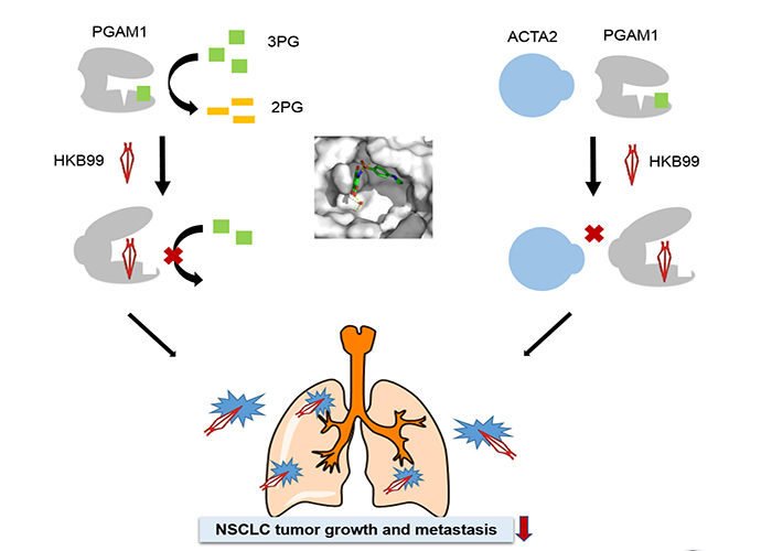 上述三个课题组运用多种技术手段,通过基于结构的药物设计改造优化得到了一种新型的PGAM1别构抑制剂(命名为HKB99),具有高选择性、高活性、低毒性优势。研究显示,HKB99通过抑制3-PG向2-PG的转化阻断细胞内生物大分子合成和破坏氧化还原稳态,使得非小细胞肺癌和厄洛替尼耐药的肺癌细胞无法生长。此外,HKB99通过抑制PGAM1蛋白与ACTA2蛋白的相互作用进一步抑制非小细胞肺癌细胞的转移(图1)。该研究工作以小分子同时干预蛋白的酶和非酶功能的双重作用,进一步验证了PGAM1是一个治疗肺癌的潜在药物靶标,为开发具有全新作用机制的抗肿瘤药物提供了新的方向。