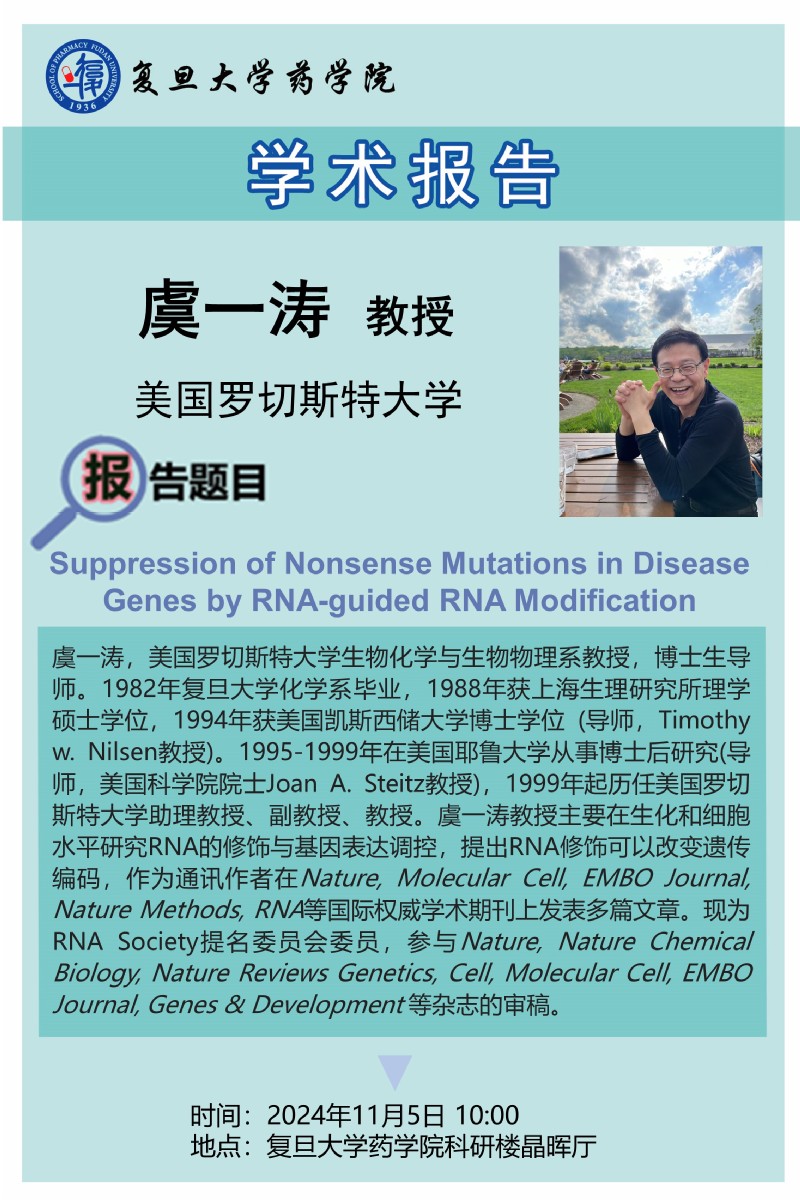11月5日学术报告 - Suppression of Nonsense Mutations in Disease Genes by RNA-guided RNA Modification