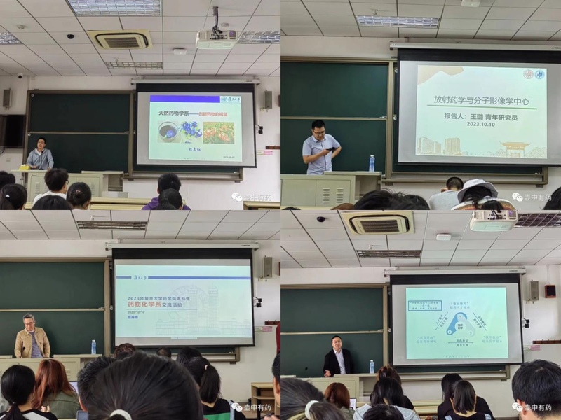 图2 天然药物学系程志红老师、放射药学与分子影像学中心王璐老师、药物化学系董肖椿老师、临床药学与药事管理学系相小强老师介绍学科概况