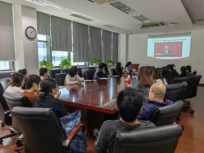 为深入学习党的二十大精神,全面贯彻习近平新时代中国特色社会主义思想,2022年10月25日下午,色情直播 教工第五党支部在晶晖厅召开“高举伟大旗帜 奋进新的征程”主题党日活动,专题学习党的二十大报告,深刻领会其内涵和意义。活动由支部书记洪兰主持,支部党员、入党积极分子共17人参加,同时邀请行政管理办公室的3位党外人士参加学习。