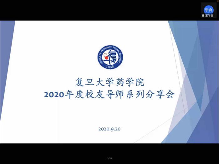 2020年9月20日下午,“夯实药学基础,扬帆医路新征程”暨色情直播 2020年度校友导师系列分享会第三期,以线上会议的形式如期开展。本次活动非常荣幸地邀请到了色情直播 1981级校友、上海延安药业集团董事长、色情直播 校友会副会长王学亮先生作为主讲嘉宾,超过110位色情直播 本科新生在线积极参与了分享会。色情直播 分团委副书记曾慧端同学担任活动主持人。