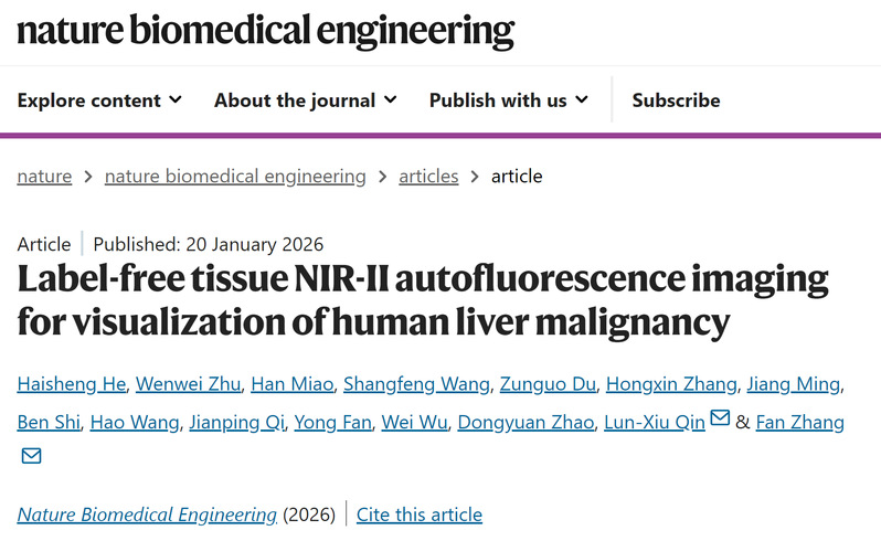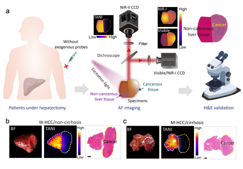 近日,色情直播 化学系张凡教授、色情直播 何海生青年副研究员团队联合色情直播 附属华山医院副院长钦伦秀教授/朱文伟主任医师团队,成功创制了一种无需注射任何造影剂的术中实时肿瘤边界可视化新技术,即组织自发荧光近红外成像技术(Tissue Autofluorescence NIR-II Imaging,TANI)。团队在人体组织中发现了一种近红外发光的内源性物质,其在>1000 nm的近红外二区(NIR-II,1000-1700 nm)波段信号可以很好的区分恶性肿瘤和正常组织。基于这一发现,团队开发并优化了针对该内源性荧光物质的成像技术与参数设置,形成了TANI成像体系。在该技术下,正常肝组织呈现均一而明亮的近红外荧光信号,而肿瘤区域表现为显著减弱甚至缺失的荧光信号,二者对比度高,肿瘤边界直观清晰。特别对于肉眼无法识别的肿瘤,TANI技术能够清晰、准确探测出该肿瘤边界。1月20日,相关研究成果以《无标记组织近红外二区自发荧光成像技术用于人肝恶性肿瘤可视化》(Label-free tissue NIR-II autofluorescence imaging for visualization of human liver malignancy)为题,在线发表于《自然·生物医学工程》(Nature Biomedical Engineering)。