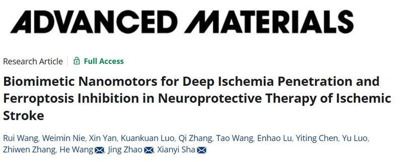 该研究以“Biomimetic Nanomotors for Deep Ischemia Penetration and Ferroptosis Inhibition in Neuroprotective Therapy of Ischemic Stroke”为题在线发表于权威期刊Advanced Materials。