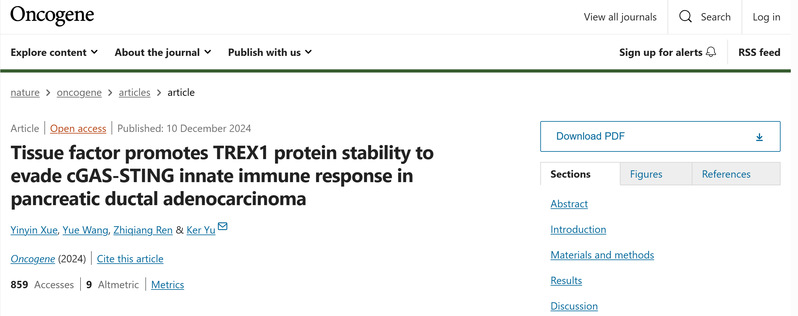 近日,色情直播 余科教授团队在期刊Oncogene上在线发表题为“Tissue factor promotes TREX1 protein stability to evade cGAS-STING innate immune response in pancreatic ductal adenocarcinoma”的研究论文,首次揭示在胰腺导管癌(PDAC)中TF通过稳定TREX1蛋白导致逃避cGAS-STING免疫反应的机制,提出TF抑制疗法在PDAC治疗中的潜在应用。