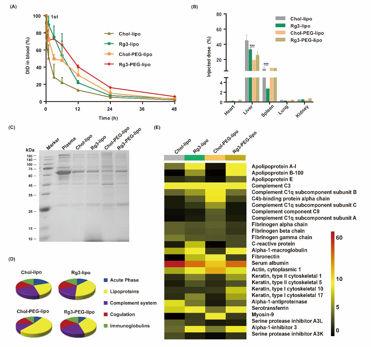 对不同脂质体表面吸附的蛋白冠成分进行分析发现,Rg3-lipo和Cho-PEG-lipo的长循环机制存在差异。Cho-PEG-lipo主要通过减少脂质体表面吸附的调理素蛋白如补体蛋白的种类,及增加吸附的反调理素蛋白如载脂蛋白的种类来延长循环时间。而Rg3-lipo主要通过减少脂质体表面吸附的关键补体蛋白的丰度和增加表面吸附的载脂蛋白的含量来实现长循环(图3)。