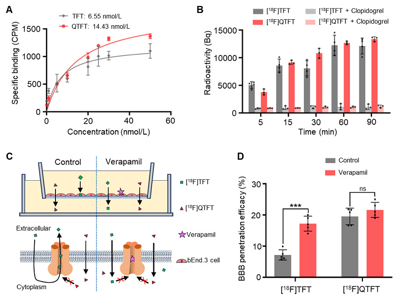 图3. [18F]QTFT显示高血脑屏障通透性和对P2Y12受体的结合亲和力。(A)使用高表达P2Y12受体的C6细胞测定[18F]TFT和[18F]QTFT的结合亲和力。(B)[18F]TFT和[18F]QTFT的时间依赖性C6细胞摄取及抑制。(C)体外Transwell评估[18F]TFT和[18F]QTFT的血脑屏障通透性示意图。(D)体外Transwell评估[18F]TFT和[18F]QTFT的血脑屏障通透性。