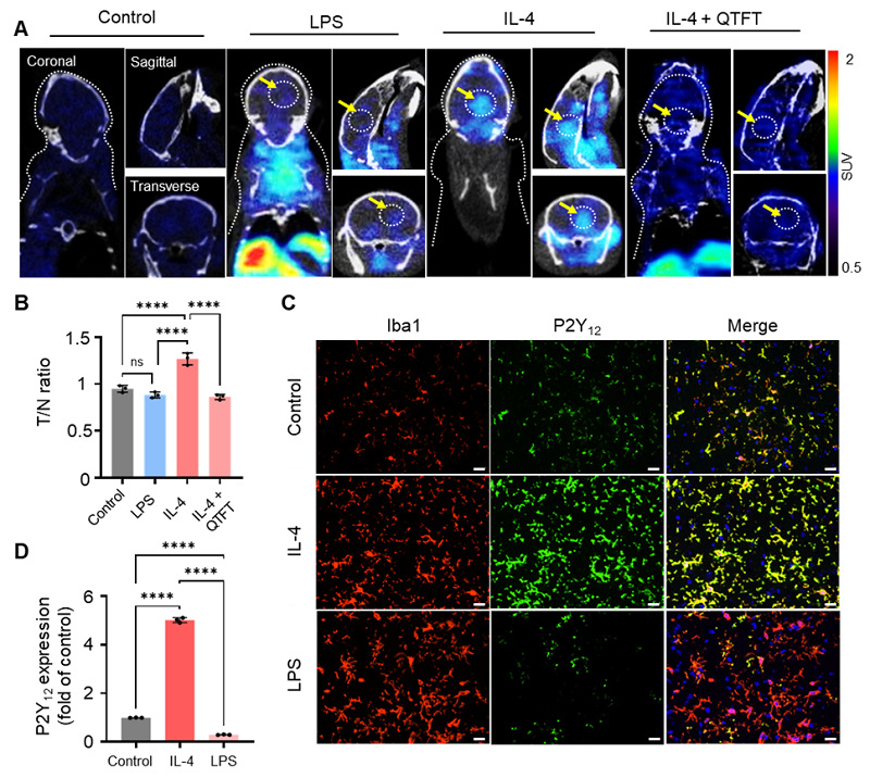 图5. [18F]QTFT可视化小胶质细胞抗炎表型极化。(A)[18F]QTFT PET/CT成像LPS-/IL-4诱导的小鼠模型。(B)对照组、LPS诱导组、IL-4诱导组和QTFT阻断IL-4诱导组的脑组织中[18F] QTFT的T/N比值。(C)对照组、LPS诱导组、IL-4诱导组和QTFT阻断IL-4诱导组的脑组织的免疫荧光染色。(D)对照组、LPS诱导组、IL-4诱导组和QTFT阻断IL-4诱导组的脑组织中P2Y12表达水平的定量。