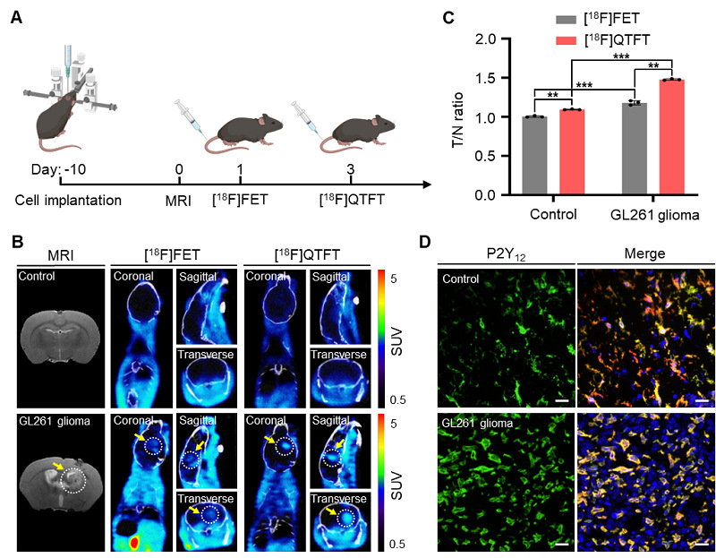 神经胶质瘤是成人中最常见的恶性脑肿瘤,其免疫抑制微环境与小胶质细胞的抗炎转化密切相关。抗炎小胶质细胞可产生生长因子,增强神经胶质瘤细胞增殖,减少神经胶质瘤细胞凋亡,促进肿瘤细胞迁移。因此,抗炎小胶质细胞的PET成像将有助于脑神经胶质瘤的定位和免疫治疗的评估。研究团队首先通过颅内注射GL261细胞构建神经胶质瘤小鼠模型,并使用T2加权MRI确认肿瘤形成。随后,利用[18F]QTFT对神经胶质瘤进行成像,并将其与临床应用的肿瘤氨基酸代谢示踪剂[18F]FET进行比较。结果显示,与[18F]FET相比,[18F]QTFT在肿瘤检测中表现出更高的靶本比。[18F]QTFT的T/N值为1.47±0.01,高于[18F]FET(1.17±0.02)。免疫荧光染色进一步证实[18F]QTFT特异性地对表达P2Y12受体的小胶质细胞进行成像(图8)。
