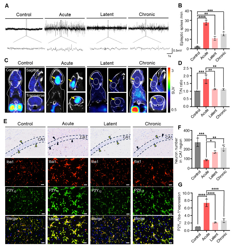 图6. [18F]QTFT通过定位抗炎小胶质细胞可视化癫痫病灶。(A)对照组、急性期组、潜伏期组和慢性期组癫痫小鼠模型的脑电图。(B)急性期、潜伏期和慢性期癫痫模型中的癫痫波峰数。(C)对照组、急性期组、潜伏期组和慢性期组癫痫小鼠模型[18F]QTFT PET/CT图像。(D)对照组、急性期组、潜伏期组和慢性期组的T/N比值。(E)对照组、急性期组、潜伏期组和慢性期组脑组织的尼氏染色和免疫荧光染色。(F)CA1区域中神经元数量。(G)P2Y12和Iba1均阳性表达的细胞统计。