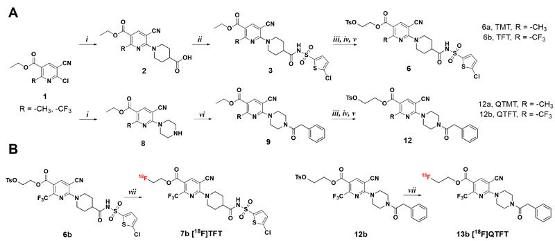 图1. 靶向P2Y12放射性示踪剂的合成。(A)TMT、TFT、QTMT和QTFT前体的合成。(i)3-氮环丁酸,DIPEA,乙醇,60 ℃,1小时;(ii)5-氯噻吩-2-磺酰胺,EDC,HOBT,DIPEA,二氯甲烷,0 ℃至常温,24小时;(iii)氢氧化锂(1.0 M),四氢呋喃,水,常温,3 小时; 乙醇,50 ℃,12 h;(iv)乙二醇,EDC,DMAP,二氯甲烷,0 ℃至常温,5小时;(v)对甲苯磺酰氯,DMAP,吡啶,0 ℃至常温,3小时;(vi)哌嗪,DIPEA,乙醇,60 ℃,1小时。(B)[18F]TFT和[18F]QTFT的放射合成。(vii)18F-,K2.2.2,碳酸钾,乙腈,10分钟。
