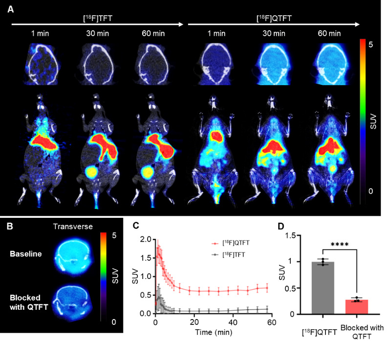 图4. [18F]QTFT显示脑部摄取水平高于[18F]TFT。(A)[18F]QTFT和[18F]TFT的动态PET/CT成像正常C57BL/6小鼠。(B)[18F]QTFT的静态PET/CT成像正常C57BL/6小鼠和QTFT阻断后成像。(C)[18F]QTFT和[18F]TFT的动态PET/CT成像的时间-活度曲线(TAC)。(D)[18F]QTFT的静态PET/CT成像和QTFT阻断后成像脑部标准化摄取值(SUV)。