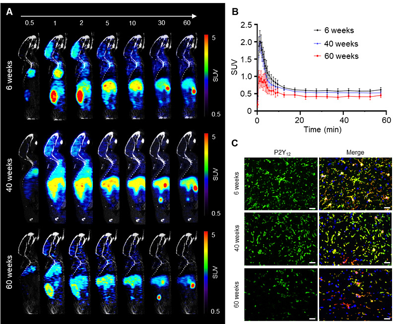 衰老是导致神经退行性疾病的最大的风险因素之一,因此,了解小胶质细胞随衰老而转化的时空动态对于预防或治疗与年龄相关的疾病至关重要。研究团队为了可视化衰老小鼠中小胶质细胞P2Y12表达的差异,利用[18F]QTFT对6、40和60周小鼠的小鼠模型进行了动态PET/CT成像分析,结果显示[18F]QTFT 6周年轻小鼠的大脑中表现出更高的摄取率(SUV=0.61±0.06),而在40周和60周龄中,SUV分别为0.52±0.04和0.45±0.06。这些结果表明,[18F]QTFT定量衰老过程中P2Y12受体表达的降低。(图7)。