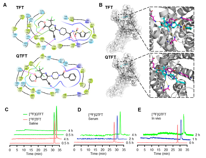 图2. [18F]TFT和[18F]QTFT 表现出较高的代谢稳定性。(A)TFT和QTFT的2D结合模式。(B)TFT和QTFT与P2Y12受体结合的共晶结构(PDB ID:4PXZ)。(C)[18F]QTFT和[18F]TFT在盐水中的体外稳定性。(D)[18F]QTFT在小鼠血清中的体外稳定性。(E)[18F]QTFT在体内稳定性。