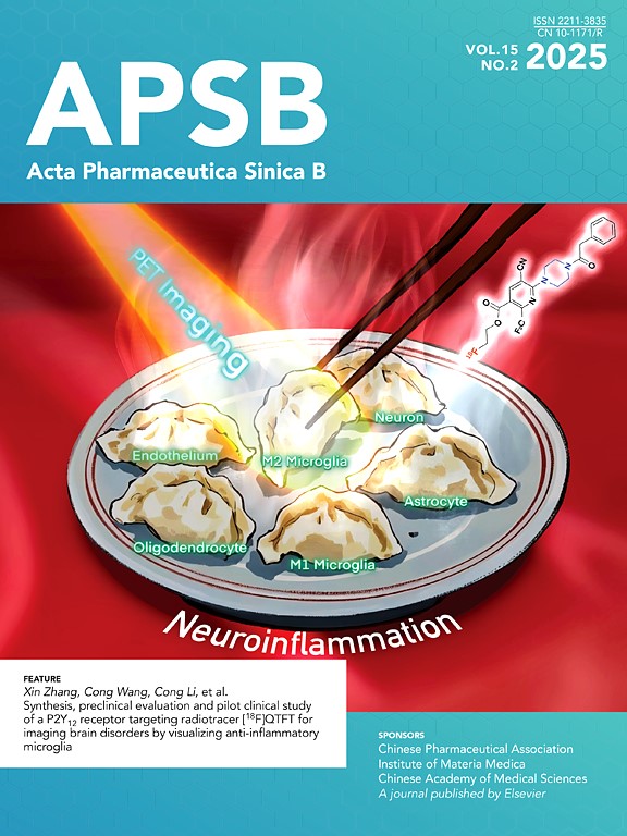 近日,色情直播 李聪教授、王聪青年研究员和色情直播 附属华山医院神经外科张新主治医师在Acta Pharm Sin B(药学学报B)杂志以封面发表了题为:“Synthesis, Preclinical Evaluation, and Pilot Clinical Study of a P2Y12 Receptor Targeting Radiotracer [18F]QTFT for Imaging Brain Disorders by Visualizing Anti-Inflammatory Microglia”(P2Y12受体靶向放射性探针[18F]QTFT的合成、临床前评价和探索性临床研究-可视化抑炎表型小胶质细胞定位脑部疾病)研究型论文。该工作构建了靶向嘌呤能受体(P2Y12)的小分子PET探针[18F]QTFT,其不但对P2Y12受体具有高亲和力(14.43 nmol/L),而且还表现出较好的血脑屏障通透性,实现了抑炎表型小胶质细胞相关多种脑部疾病可视化。该论文被Acta Pharm Sin B杂志选为当期封面论文,并邀请了海军军医大学盛春泉教授对该工作进行专栏评述。