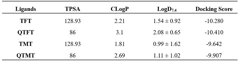 中枢神经系统PET放射性示踪剂的血脑屏障通透性通常受分子理化特性的影响,例如拓扑极性表面积(TPSA)、分子量、亲脂性、pKa、游离氢键、血浆蛋白结合和外排转运蛋白。四种配体的理化参数如表1所示,低TPSA和较高的亲脂性值表明QTFT和TFT的结构具有理想的血脑屏障通透性和受体亲和力。