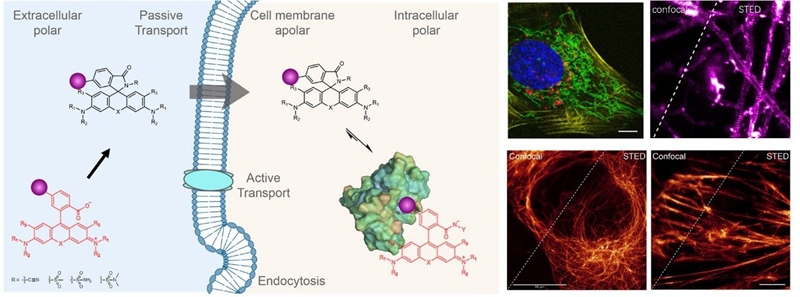近日,王璐青年研究员和Kai Johnsson教授通过引入不同取代的苯磺酰胺以及烷基酰胺,能够更精准、更大范围地调节开闭环结构的平衡。在基本不改变染料光学性质的基础上,通过调节开闭环结构的比例,以满足不同蛋白标记、不同超分辨显微成像技术的特定需要。