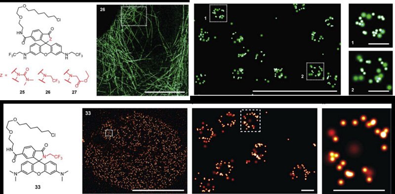 而通过引入给电子能力更强的烷基酰胺的结构,可使罗丹明类染料大部分处于无荧光螺内酯结构,仅少数分子发射荧光信号。同时,此类染料由于动态平衡过程可产生自闪烁荧光信号,因而可用于微管蛋白和核孔结构的单分子定位超分辨成像(SMLM)(图3)。