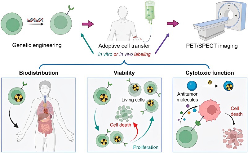 嵌合抗原受体 (CAR) T细胞疗法在治疗血液系统恶性肿瘤方面取得了空前成功,然而其对实体瘤治疗面临多重挑战。首先,肿瘤细胞的可及性:CAR T细胞到达肿瘤实质之前必须克服血管屏障、基质屏障、肿瘤间质液压力等多种生理障碍。其次,肿瘤免疫抑制微环境的负面影响:多种免疫抑制细胞如调节性T细胞、肿瘤相关巨噬细胞和髓系抑制性细胞通过分泌一系列抗炎细胞因子和趋化因子抑制CAR T活性。此外,即使CAR T细胞在肿瘤中存活,但其是否维持对癌细胞的杀伤作用仍需确定。因此,实现CAR T细胞活体条件下肿瘤可及性、生存能力和细胞毒作用成像,对监测并改进CAR T疗效至关重要。各类成像技术中,以正电子发射断层扫描 (PET)和单光子发射计算机断层扫描 (SPECT)为代表的放射性成像兼具高灵敏度、高组织穿透深度、信号可定量等优势,是无创活体评价CAR T细胞的理想工具。