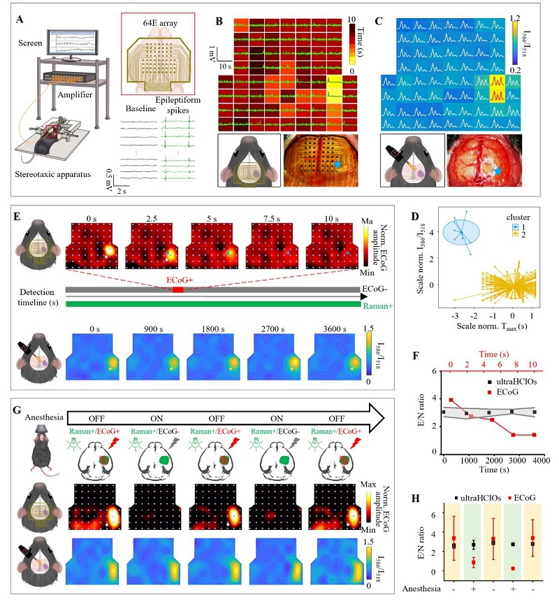 图 4. UltraHOCls术中定位致痫灶比ECoG具有更好的性能。(A) ECoG原位监测KA诱导的癫痫模型小鼠的示意图。(B) 通过64导ECoG电极采集KA癫痫模型小鼠脑电信号,星号代表致痫灶。(C) UltraHOCls展示出了与64导ECoG电极阵列相媲美的定位精度。(D) 对由UltraHOCls和ECoG确定的致痫灶数据进行均值聚类分析。(E) 动态ECoG map成像显示致痫灶内神经元瞬时超兴奋性,在发作开始后10秒内迅速衰减至基线。相比之下,ultraHOCls在1小时的操作时间窗口内持续定位致痫灶。(F) E/N比率和ECoG幅度的时间演变。(G) 在麻醉“开-关”周期中,活体模型小鼠脑部的拉曼/ECoG信号map图。+,2%异氟烷麻醉;-,移除麻醉;Raman+/ECoG+,阳性拉曼/ECoG信号;Raman+/ECoG−,阳性拉曼信号但仅背景ECoG信号。(H) 使用或不使用麻醉处理的KA诱导的癫痫模型小鼠中ultraHOCls和ECoG的E/N比率。