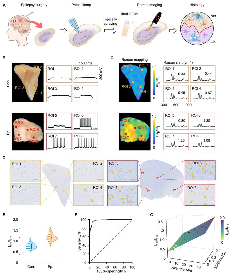 图 7.UltraHOCls成像来自DRE患者切除组织样本癫痫病灶。(A) 实验流程示意图。(B) DRE患者和对照患者的切除新鲜标本中选定ROI注射0-pA电流诱导的动作电位(AP)序列的照片及其对应的AP序列。(C) 在脑切片选定ROI喷洒ultraHOCls后的拉曼信号mapping图及典型拉曼光谱。(D) 来自DRE患者和对照患者切除组织中的MPO免疫组化。比例尺为100 μm。(E) 喷洒ultraHOCls后脑切片中I586/I518比值的小提琴图。(F) ROC曲线显示ultraHOCls在区分癫痫组织与非癫痫组织方面的性能。(G) I586/I518比值与MPO表达及由0-pA至140-pA范围内的电流注射诱导的平均动作电位序列数量成正比。