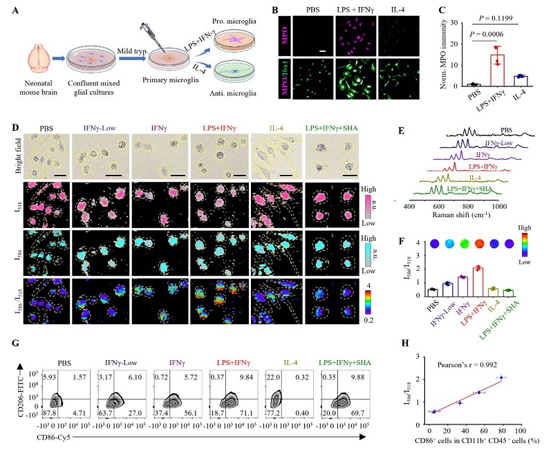 图3. UltraHOCls成像促炎小胶质细胞。 (A) 原代小鼠小胶质细胞分离和极化示意图。(B) 激活的小胶质细胞中Iba1和MPO的免疫荧光染色图像。比例尺,50 μm。(C) 小胶质细胞中MPO免疫染色的定量分析。(D) UltraHOCls成像不同处理后的小胶质细胞共聚焦拉曼显微成像。IFNγ-Low:40 ng/mL IFNγ;IFNγ:100 ng/mL IFNγ;LPS+IFNγ:600 ng/mL LPS加100 ng/mL IFNγ;IL-4:40 ng/mL IL-4;LPS+IFNγ+SHA:600 ng/mL LPS加100 ng/mL IFNγ随后加入SHA(500 μM)。比例尺,30 μm。(E) 图像中标记区域收集的典型拉曼光谱。(F) 平均I586/I518比值。(G) 不同处理后的原代小胶质细胞表型极化的流式细胞术分析。(H) I586/I518比值与CD86+小胶质细胞百分比的关系图。