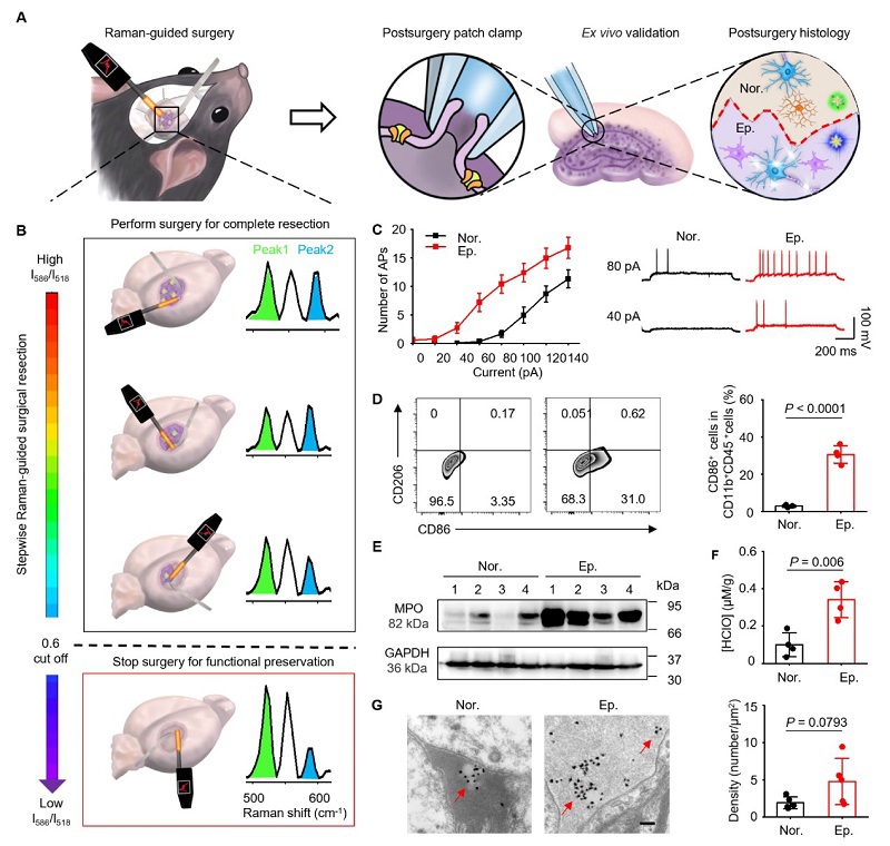 图 5. UltraHOCls可视化促炎小胶质细胞引导癫痫手术。 (A) UltraHOCls引导癫痫手术策略示意图。(B) 左侧:UltraHOCls引导致痫灶切除实验示意图;右侧:手术过程中收集的代表性拉曼光谱。(C) 来自癫痫模型小鼠切除切片神经元的膜片钳记录。左图:由0-pA至140-pA范围内的电流注射诱导的动作电位(APs)数量。右图:通过注入40-pA和80-pA电流诱导的代表性细胞放电。(D) 代表性流式细胞术结果及KA诱导的癫痫模型小鼠切除的癫痫组织与正常组织中促炎性小胶质细胞(CD86+CD11b+CD45mid+)的定量分析。(E) 癫痫模型小鼠切除的癫痫组织与正常组织中MPO表达的Western blot分析。(F) 癫痫和正常脑匀浆中的HOCl浓度。(G) 代表性TEM图像及癫痫模型小鼠切除的癫痫组织与正常组织中UltraHOCls的定量分析。比例尺为200 nm。红色箭头指示大脑中的金纳米粒子。