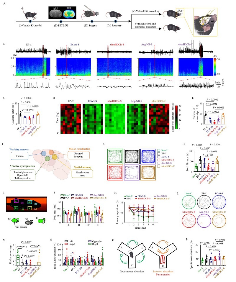 图6. UltraHOCls引导手术减轻了小鼠癫痫发作并保护了神经功能。 (A) 实验流程图。(B) 各实验组代表性EEG、能谱图及EEG轨迹水平扩展图。(C) EEG海岸线指数的量化。(D) 在14天内,每个小鼠的癫痫样活动热图。(E) 阵发性放电的癫痫发作频率。(F) 行为测试的实验方案及关键主导脑区示意图。(G) 旷场测试小鼠10分钟运动轨迹图。(H) 旷场测试中的总行走距离。(I) 代表性Catwalk步态分析测试图和参数示意图说明。(J) Catwalk步态分析中印迹面积量化。(K) Morris水迷宫训练。(L) Morris水迷宫实验轨迹图。(M) 和 (N) 试验中平台穿越次数(M)和在目标象限停留时间(N)的量化统计。(O) Y迷宫测试中自发交替(正确交替)、错误交替示意图。(P) Y迷宫测试中自发交替百分比。