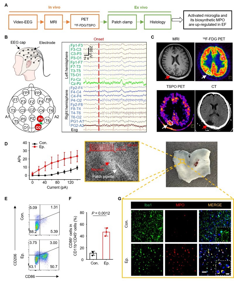 图1. 难治性癫痫患者致痫灶内促炎型小胶质细胞积聚增加。 (A) 实验流程图。(B) DRE患者头皮EEG示意图(左);一名22岁复杂部分性发作DRE患者的代表性发作期EEG记录(右)。在右侧顶枕区O2和P4电极处发现了频繁尖波的EEG起始点(红色虚线)。(C) DRE患者的术前T1加权MR、¹⁸F-FDG、TSPO PET成像以及术后CT图像。箭头指示右侧顶枕区。(D) 左,由0-pA到140-pA范围内,外加电流诱导的动作电位数量;中,新皮质切片膜片钳采集明场图像;右,来自DRE患者的新鲜标本照片。(E和F) 流式细胞术分析(E)及定量(F)显示从癫痫和对照患者切除组织中的促炎性小胶质细胞(CD86+CD11b+CD45mid+)。(G) 免疫荧光染色评估癫痫和对照脑组织中MPO与Iba1的共定位,比例尺:50 μm和5 μm。