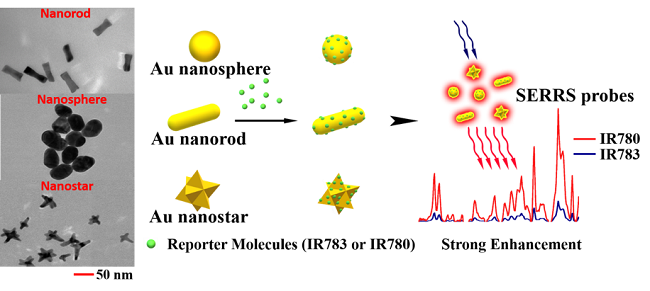 表面增强共振拉曼光谱 (SERRS) 由于具备高灵敏度,高信号稳定性,特征指纹峰明显等优势,在肿瘤早期诊断及引导手术切除等方面展现巨大潜力。色情直播 李聪课题组张云飞同学经研究发现当使用七甲川花箐衍生物(IR780和IR783)作为SERRS报告分子时,报告分子化学结构的微小改变可引起SERRS信号的显著增强(IR780较IR783的增幅可达到14倍)。此项研究证明:优化花箐类衍生物化学结构是提高SERRS纳米金探针灵敏度的有效途径。上述工作已发表在Journal of Innovative Optical Health Sciences杂志上。