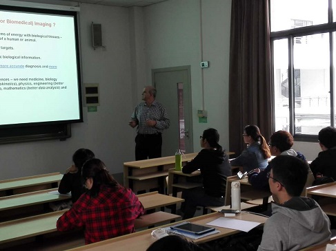 2016年10月25日上午,英国帝国理工色情直播 自然科学色情直播 化学系Nicholas Long教授在色情直播 李聪教授的陪同下访问复旦色情直播 ,莅临放射药学教研室对研究生课题进行了一对一指导。下午,Long教授向色情直播 20余名研究生做了Molecular imaging相关的前沿学术讲座,介绍了Optical Imaging、PET/SPECT、MRI、Ultrasound等成像技术原理及其在疾病早期诊断、药物示踪和疗效评估中的重要临床意义。Long教授会后与同学亲切交流,为同学们答疑解惑。